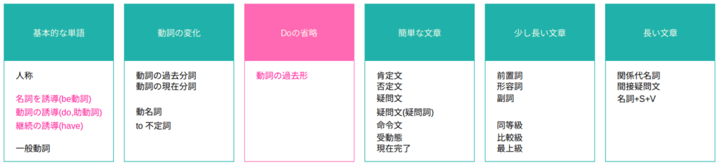 また、be動詞やdo、助動詞、haveは機能を明確にして「名詞を誘導」「動詞の誘導」「継続の誘導」という分類にした。
